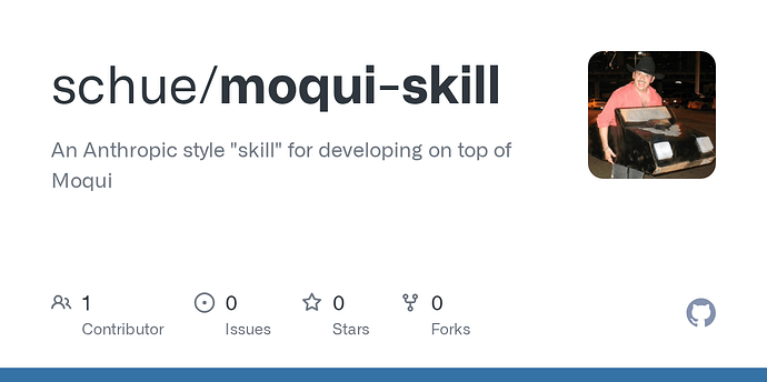 So I used the skill creating skill to create a Moqui skill. I’ve been coding with it all day and it hasn’t blown up. I think it’s making things better? It seems like it is. I’d be curious to hear back from anyone who tries it: